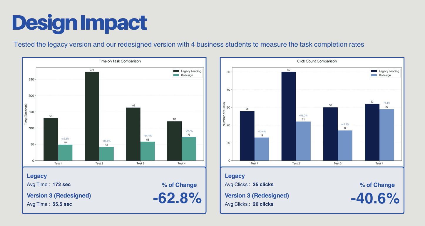 To validate the impact of our redesign and Jason’s new experience, we conducted task-based usability tests comparing the legacy system with our redesigned version. Four business students completed identical reporting tasks in both systems, revealing substantial improvements. On average, users completed tasks 62.8% faster, reflecting how streamlining navigation, clarifying terminology, and structuring the reporting flow made the workflow much clearer. Additionally, users required 40.6% fewer clicks to achieve the same outcomes. These results demonstrate that our redesign significantly reduced cognitive load, creating a reporting process that is more direct, predictable, and efficient.